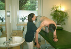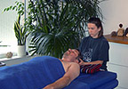 Der grüne Raum bietet mit seinen extra breiten Behandlungsliege besonders Menschen mit neuroligischen Problemen in der Therapie eine große Unterstützungsfläsche und ermöglicht ihnen müheloses Drehen. Seine ruhige Stimmung unterstützt Entspannungsbehandlungen wie die Cranio Sakrale Therapie.